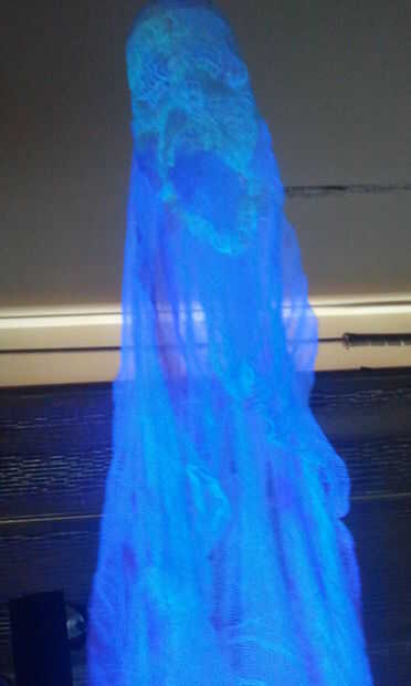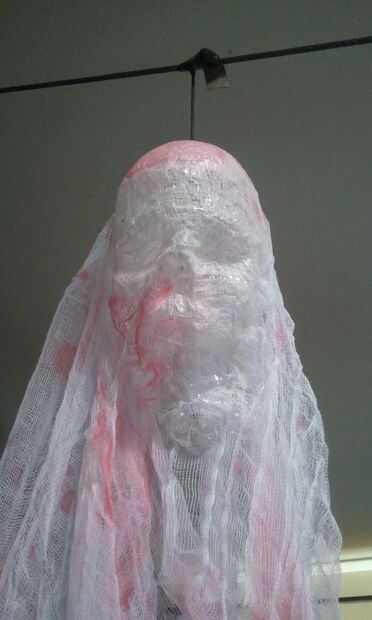 Para crear una espeluznante fantasma de Lady - la pinté con un cráneo de boca cerrada y he pintado a lo largo de la línea de la mandíbula. Tengo suerte y hace un agujero en el ojo izquierdo creando un agujero en la gasa. Se parece a un espeluznante, espeluznante eye.* **