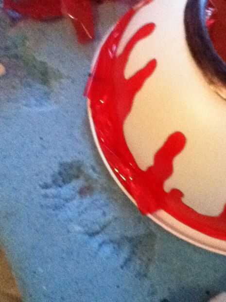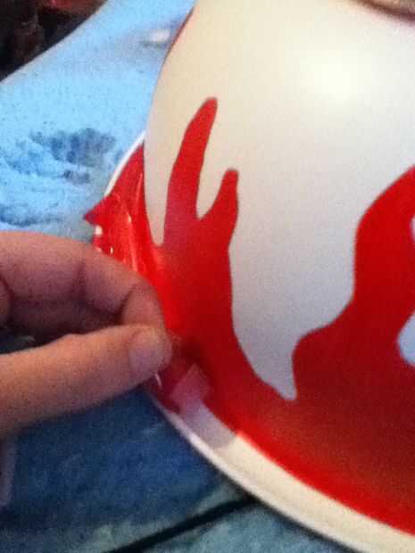 Cinta su celofán de chatarra en el borde de la taza, si usaste rojo. Si no, sólo de color el borde rojo con un rotulador.