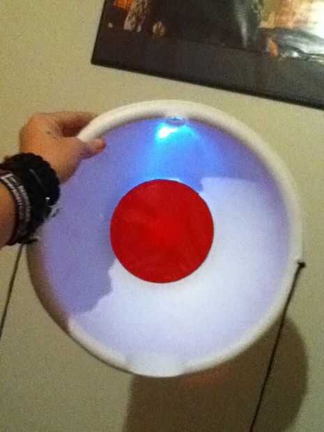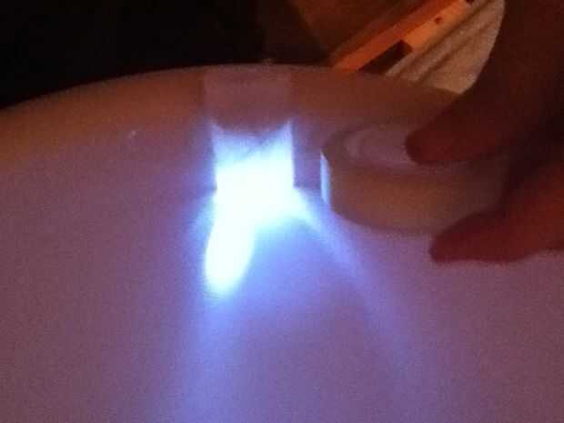 Tu luz en el borde superior del recipiente de la cinta. Debe crear un efecto de resplandor. Esto es realmente espeluznante para Halloween. Se ve impresionante con una sola luz, sin embargo, usted realmente no podía verlo con mi cámara así que agregué una linterna para ayudar a visualizar.