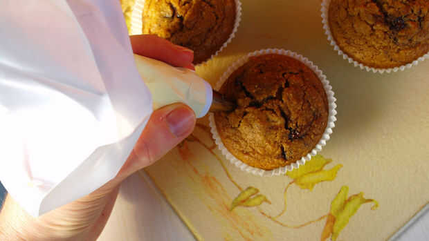 1) poke algunos agujeros en los cupcakes, sólo usé la punta de la Manga pastelera pero también puede usar la parte posterior de una cuchara o incluso su pinky.