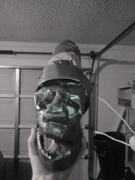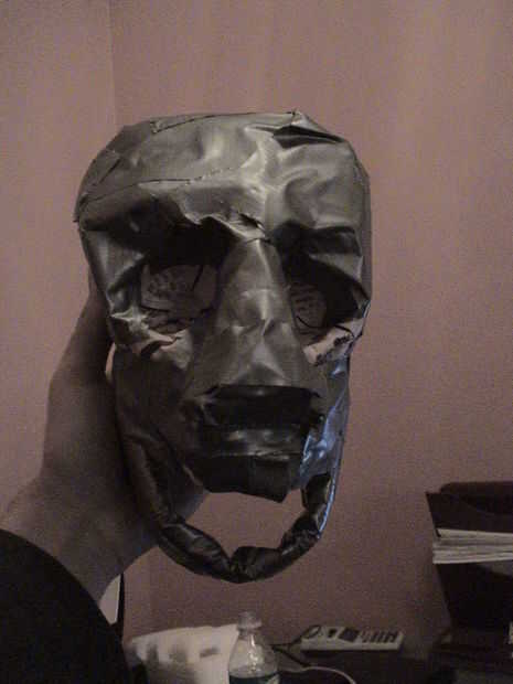 Con cinta y periódicos arrugados, se acumulan características faciales de Santa sobre el cráneo.