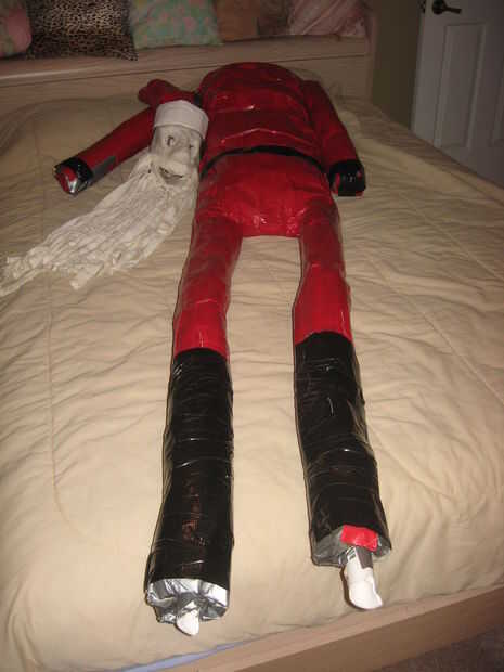 Utilizando alguna cinta negra, dio Santa un cinturón y unas botas.