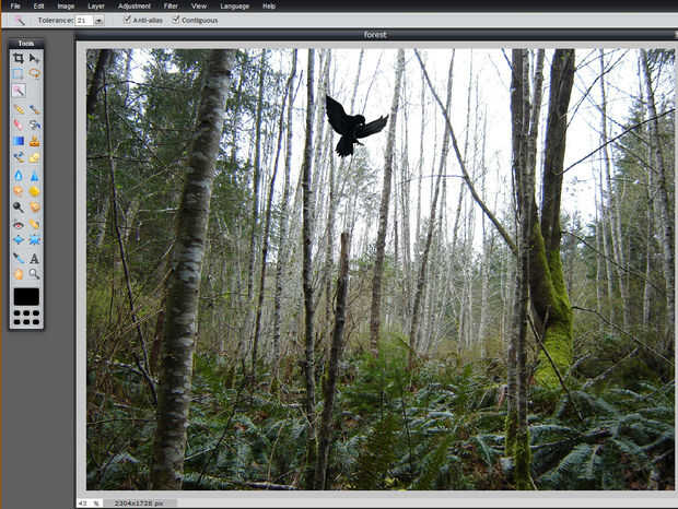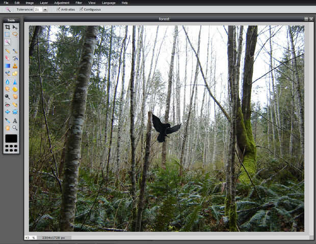 • Esto pone el cuervo de tamaño completo en el centro de la pantalla en una nueva capa. Para mover, redimensionar y rotar el menú Editar y seleccionar transformación libre y mover el cuervo donde usted lo desee. Al colocar el cuervo en la foto considere el uso de la regla de los tercios para una mejor composición.  Por desgracia, los árboles más grandes ocupan ese espacio en mi foto así que puse el cuervo más cerca del centro.