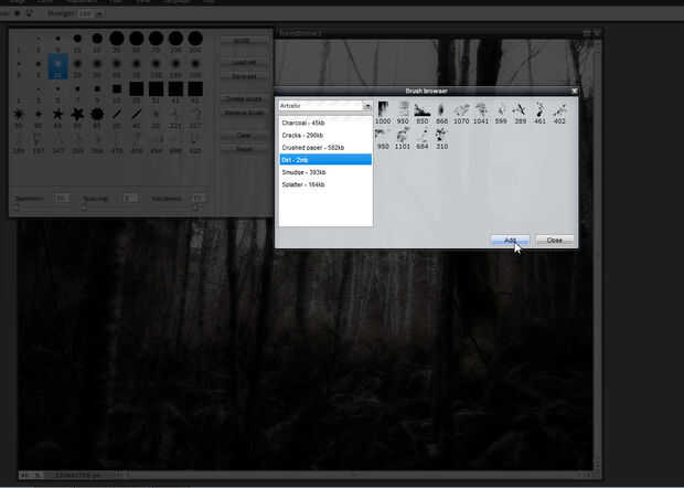 • Haga clic en más. En el navegador de pincel , seleccione de los estilos de pincel diferente, utiliza la suciedad, luego haga clic en Agregar.