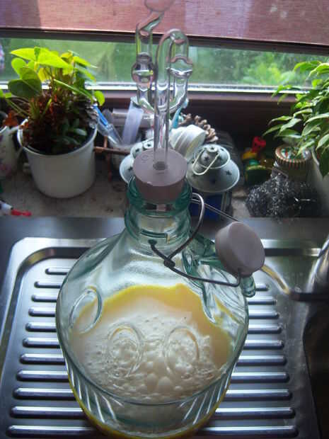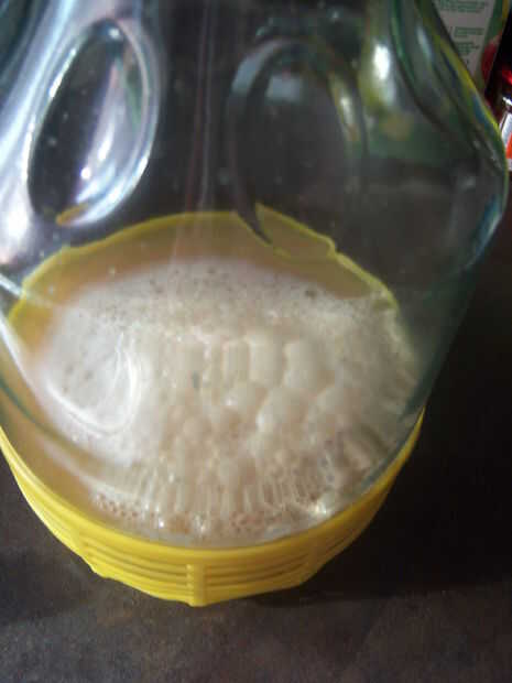 La levadura tiene inicio con el trabajo de theire. Puede ver las burbujas en la parte superior. Fermentó el azúcar del jugo ácido carbónico y alcohol--> delicioso