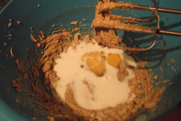 • Agregue los huevos y la leche y batir hasta combinar - puede cuajar pero no te preocupes que eso cambiará cuando se agrega la harina de maíz/polenta