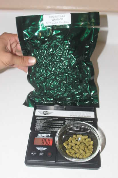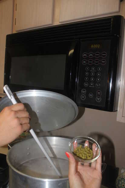 Después de la hierba vuelve a hervir vas a comenzar su adición de saltos de 60 minutos. Vas a querer mantenerlo a hervir durante este tiempo. Para una ale rubia la cantidad de lúpulo es muy pequeña y solamente agregaremos los en la marca de 60 minutos. (Hay muchos otros estilos de cerveza que añadir lúpulo en el 15, 10, 5 minuto marca e incluso después de la llama hacia fuera).