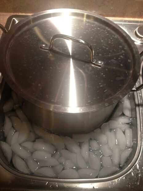 Después de sus 60 minutos es apagar la hornilla y conseguir su Hervidora de agua en un baño de hielo. Yo uso mi bañera para esta etapa en el proceso de elaboración de la cerveza. No hay ninguna forma correcta o incorrecta para hacer esto, tu tratando de conseguir la hierba de hasta 70 °.