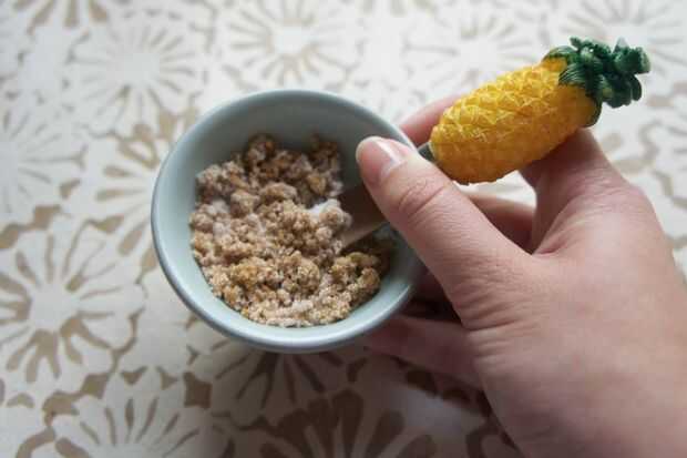 El azúcar moreno que usé tenía un poco poco de humedad, que agrupan un poco, por lo que podría hacer un poco de picar cuando se mezclan. Esto te desaparecen al agregar los otros ingredientes. Miren adorable pequeño esparcidor de piña. < 3