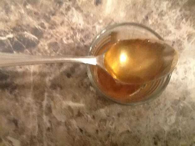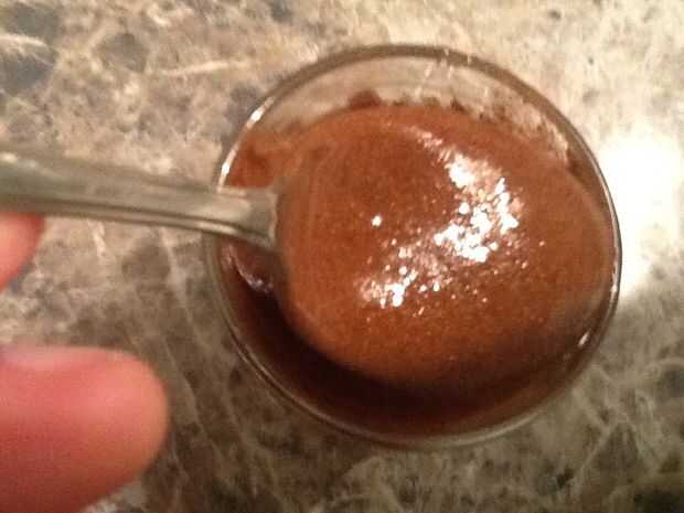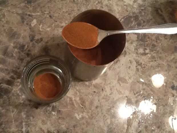 Primero poner aproximadamente dos cucharadas de canela en la Copa (Foto 1). Luego, agregar tres cucharaditas de miel en la Copa (Foto 2). Luego revuelva hasta llegar una pasta (Foto 3).