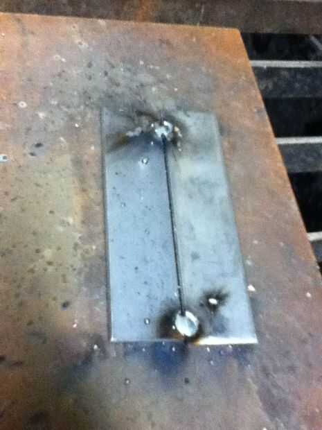 Aviso al principio del vídeo en la página siguiente que hay dos soldaduras de pequeños "tachuela" hechas. Esto es para asegurar que las dos piezas mantienen una distancia constante mientras se está soldando. De lo contrario, cuando se inicia el cordón de soldadura, el metal se deforme debido a la expansión térmica y contracción. Después se colocan las soldaduras de la tachuela, la soldadura de costura es establecida tal como se muestra en el siguiente video.