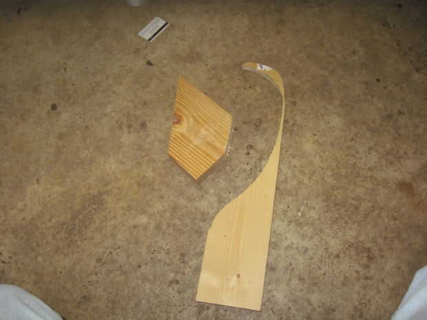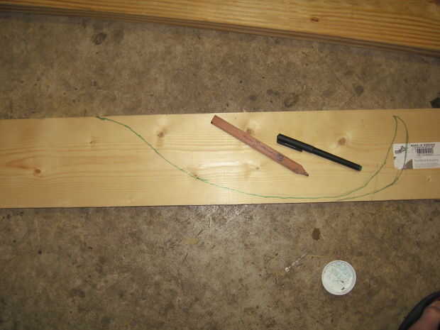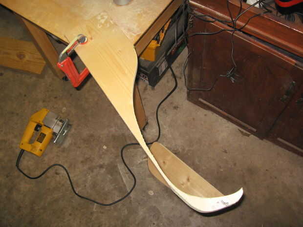 A continuación Sujete la pieza superior delgada de madera con la curva trazada en ella a una tabla conveniente. Use una sierra caladora para cortar hacia fuera. Cortando la curva interior inadvertidamente en la punta la sierra un poco que hace una superficie angular limpia. Esto fue accidental y es más probable es que malo para la sierra y potencialmente peligroso. Aquellos con más experiencia de carpintería son probablemente encogiéndose.