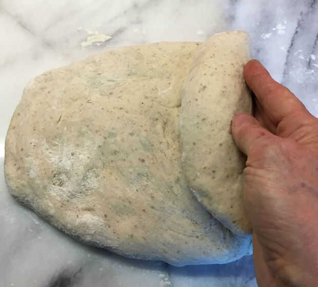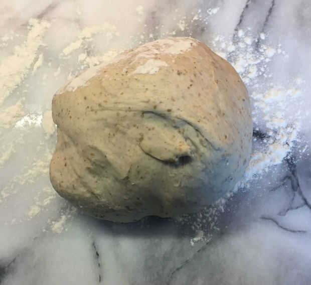 Después de que la masa ha subido, punta hacia fuera sobre una tabla enharinada y perforar hacia abajo. Aplanar en un rectángulo, luego enrollar y formar en forma de bastón con la costura de debajo. Poner en una placa para horno y cubrir con una bolsa de plástico (apoyé las esquinas usando tarros de especias, de modo que el plástico no toque la masa). Dejar subir hasta que doble su tamaño.