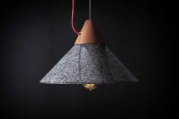 Esta lámpara colgante, de granito, es un ejercicio de contrastes que combina el clásico y el moderno, el doméstico y el industrial.
