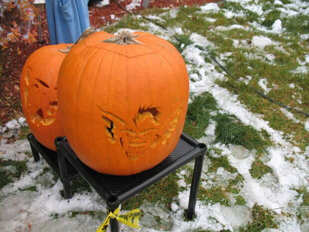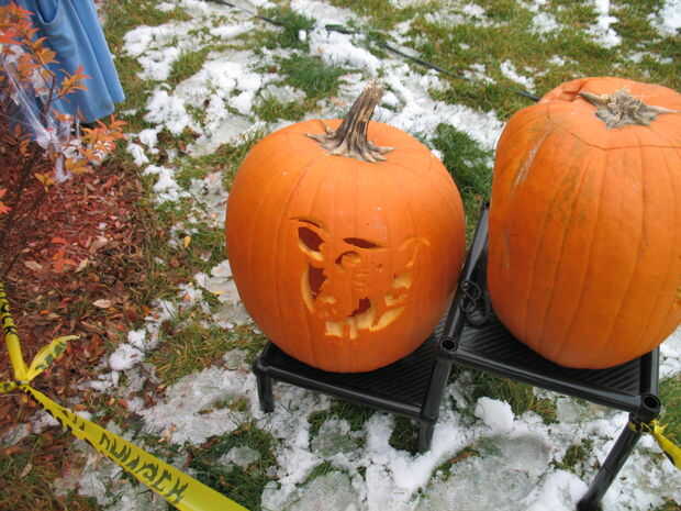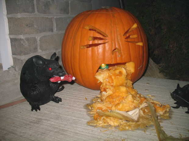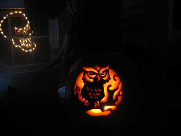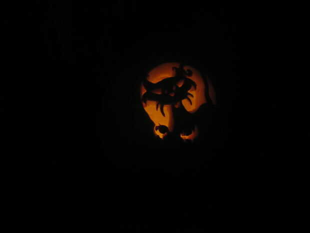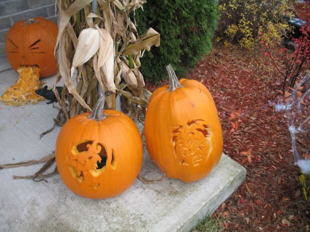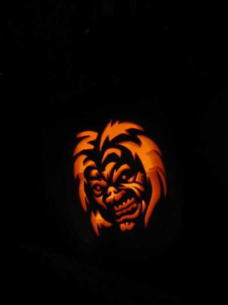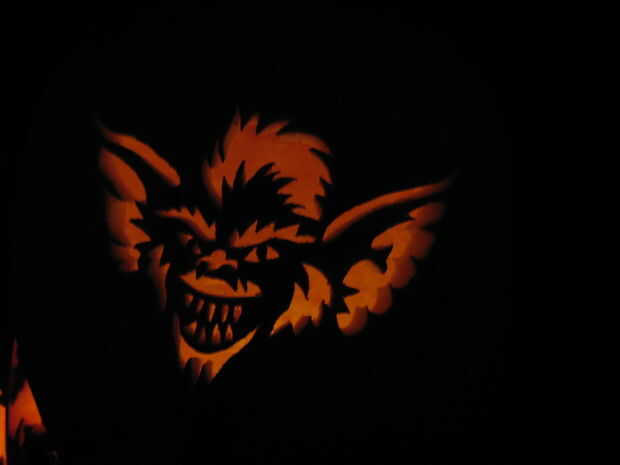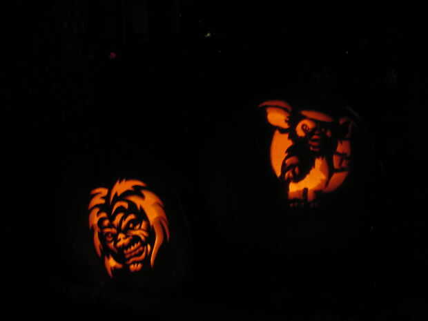 6 calabazas... Eddie (Iron Maiden), Gremlin, Gizmo, lengua de gato, lechuza en un árbol y una calabaza de Puking