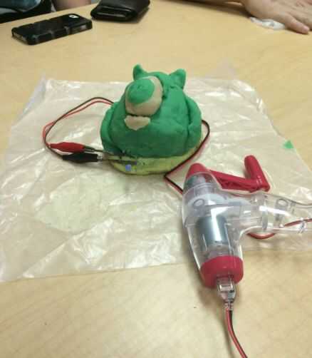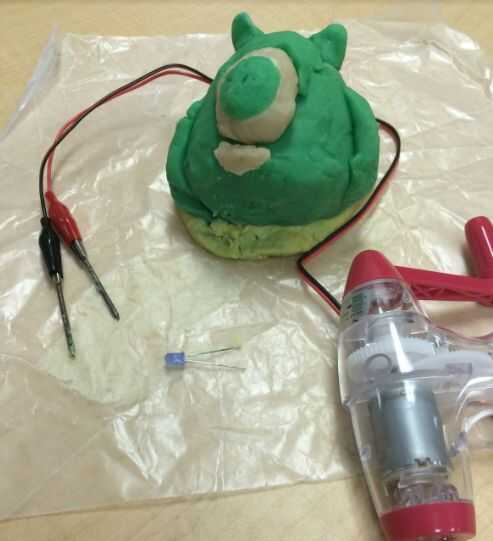 Primero colocamos uno de los dientes del led en el no conductor de electricidad y otra en la plastilina conductora.