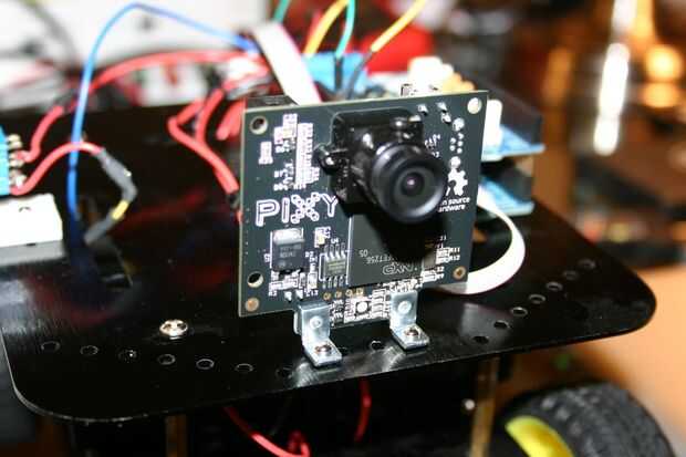 Añadir la parte superior de la placa, interruptor, dos Arduinos (uno con un escudo en la parte superior del motor) y la cámara de Pixy.