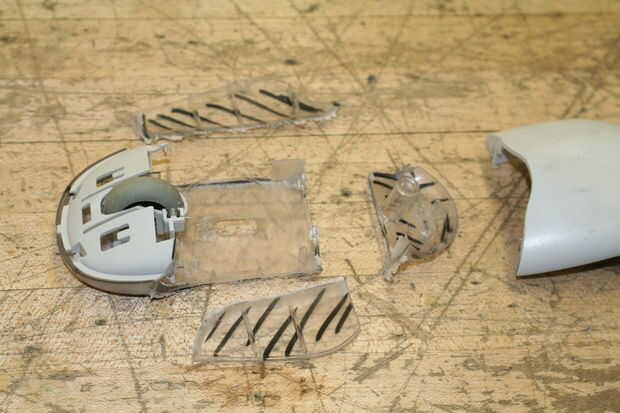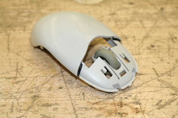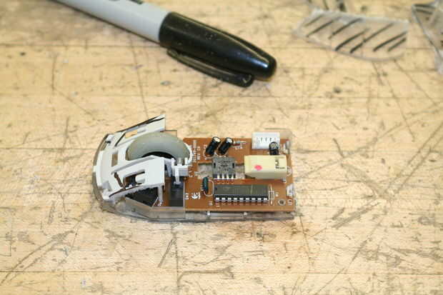 El ratón sí mismo era bastante simple. Tuve que cortar todas las cosas extra fuera y hacerlo tan pequeño como sea posible. Empecé por afeitarse unas pocas piezas de utilización de la Sierra de banda, y como tengo más cerca me cortes "finos" con la lijadora de banda...