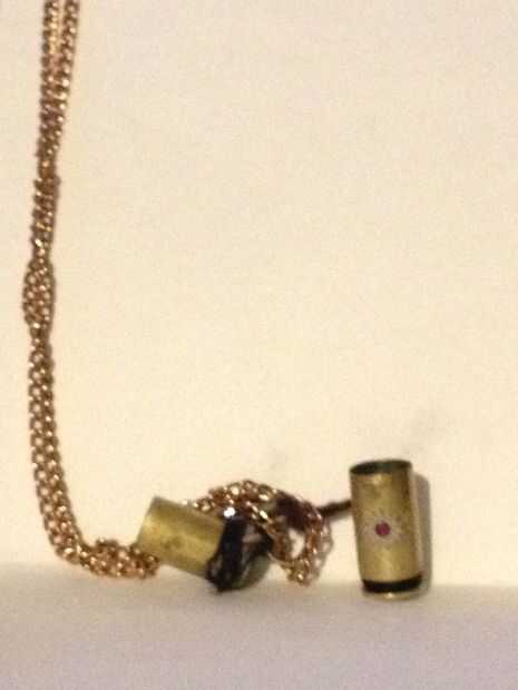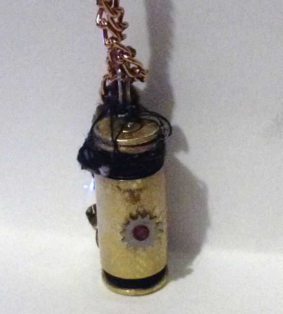 bien pude no pensar en un verdadero divertido nombre para esto, pero aquí es se trata de un medallón prier o deseo de dos conchas de bala, creo que son 45 un 9 como 2 diferentes hilo color negro y bronce, un engranaje de reloj pequeño, un pedazo rojo de plástico , un cordón de terciopelo, cadena de cobre y tres abrazaderas de uña de cangrejo de plata. Para las personas que no saben que un medallón de deseo es lo que hacer con ellos son wright su prier en una tira de papel o deseo doblar para arriba y ponen en el medallón junto con cualquier cosa de valor sentimental que es anuff pequeño para caber y el medallón sigue el prier cerca de tu corazón o deseo lo pueden hacerse realidad. también puedo perforar un pequeño agujero en la parte superior por lo que si pones algo con un enviado puede olerlo