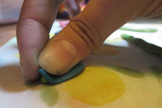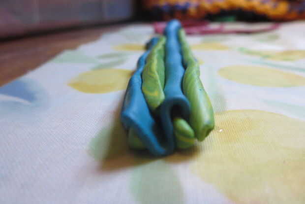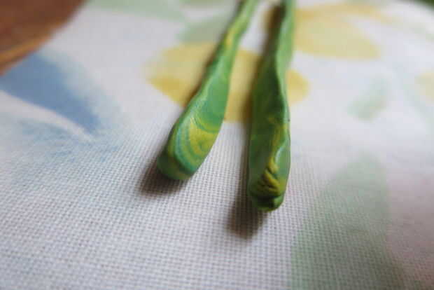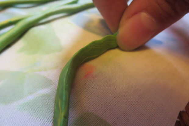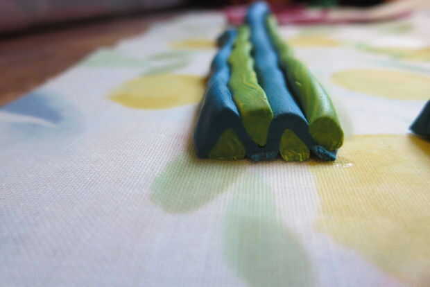 El color interno se dividen en cuatro pedazos. Rodillo en cilindros, pero entonces los forma en prismas triangulares les pellizcando y empuja hacia abajo.