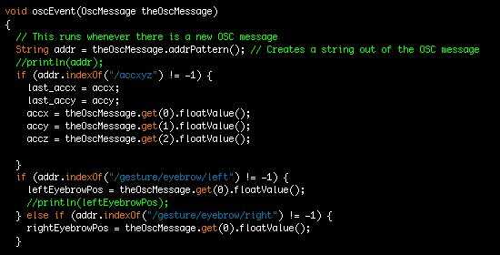 Para recibir los mensajes OSC, se requiere un método de controlador de interrupción/eventos. La manera más simple de control de eventos OSC de depuración es simplemente imprimir todo lo que se recibe mediante código como este: