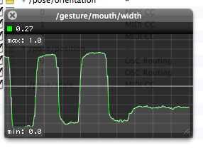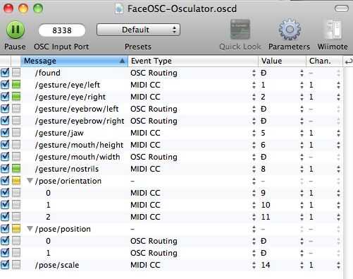 FaceOSC es una aplicación bastante simple (lamentablemente OSX 10.6 sólo) que rastrea tu rostro con tu webcam y envía mensajes de OSC a un puerto especificado. Podemos entonces leer en estos mensajes directamente en el proceso (en la nuevo puerto entrante) o volver a distribuirlos a través de un programa como Osculator a nuestro estándar Puerto entrante en el proceso. El beneficio de la encaminamiento a través de Osculator es que muy rápidamente puede representar cualquier señal que desee y averiguar de que rango de valores.