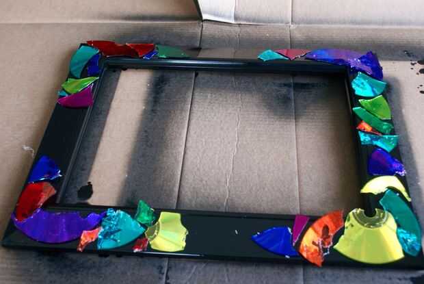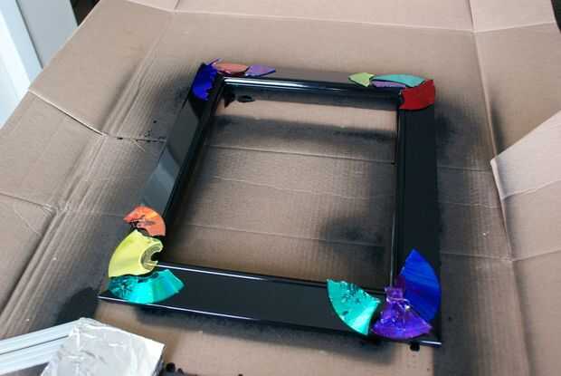 - Una vez terminadas las cuatro esquinas, empezar pegado más fragmentos de CD en el marco por trabajar desde las esquinas hacia afuera hacia el centro.