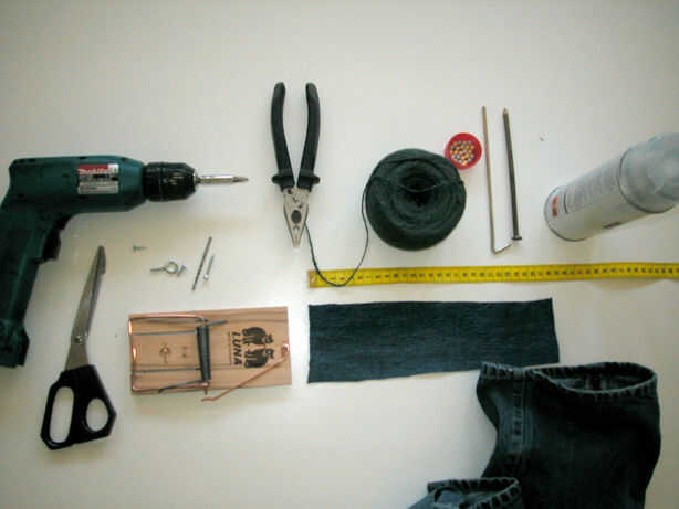 Un old fashioned rata trampa, dos tornillos pequeños, un tornillo más largo y un 'ojo de tornillo' (perdón por los errores de idioma, soy holandés), jeans viejos u otro paño fuerte.