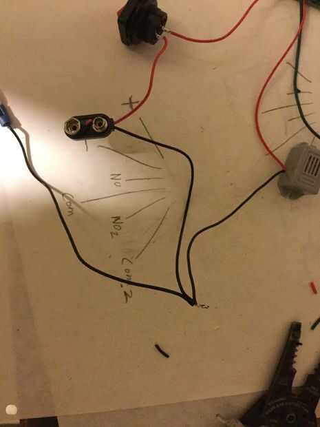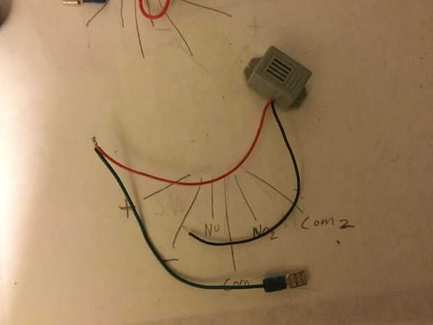 Obtener el zumbador piezoeléctrico y el sabor de un trozo de alambre (estoy usando cable verde) en el cable rojo de la alarma o el lado positivo si no sin hilos (cables, no ejecute un cable a él). Engarzar un conector en el extremo del alambre verde. En el empalme de esta, puesto en el puerto del NO del interruptor remoto.