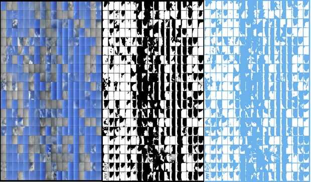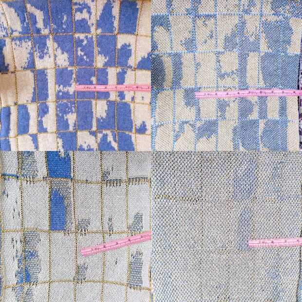 Diseñé el primer textil tomando una captura de pantalla de una historia del video Time-lapse del cielo y traducir esa imagen en algo que podía manejar la máquina de tejer dado nuestros colores de hilo máximo (3).