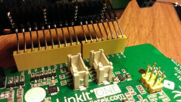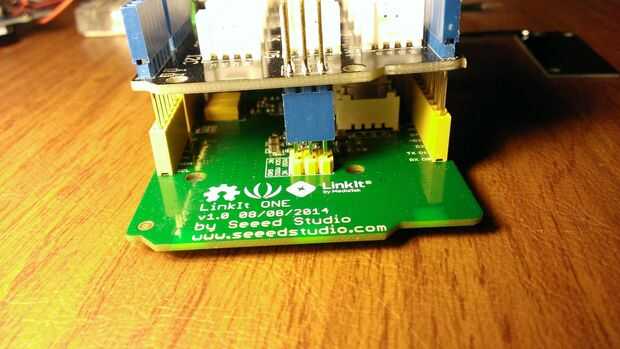 Por suerte para nosotros, el Arduino Grove Base escudo encaja perfectamente encima de LinkIT uno. Esto nos permite volver a utilizar el mismo escudo base de nuestros proyectos de Arduino. Cuidadosamente Alinee las clavijas para sincronizar hasta con arduino y presione hacia abajo. A veces esto puede tomar un poco de fuerza, por lo que es OK si tienes alguna resistencia.
