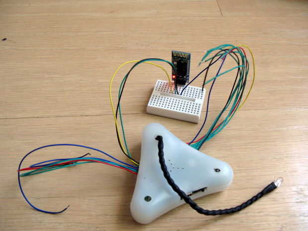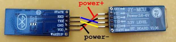 Puede alimentar el módulo de conexión a batería de Mindflex. Sólo apriete puentes entre la batería y el terminal en los dos extremos de la secuencia tres de AAA en el paquete, conecte el extremo negativo a la terminal GND marcado en el módulo de Bluetooth y el extremo más a la terminal VCC. (Asegúrese de que no invertirlo). Los terminales hembra en el cable que se puede obtener con el módulo de ayuda. Si todo funciona bien, parpadeará el LED en el módulo.