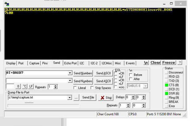 Usted deberá enviar probablemente más rápido que usted puede escribir Al + BAUD7 . Para ello, escriba en otra ventana y luego copiar y pegar en el terminal (Asegúrese de no copiar y pegar cualquier carácter fin de línea o espacio en el extremo de él). O, si usas RealTerm, simplemente sólo puede ir a la pestaña enviar, escríbala en el espacio en blanco y presione "Enviar ASCII."