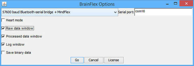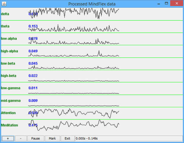 Instalar java. Instalar el archivo jar desde el enlace anterior. Lanzar el archivo jar. Seleccione "puente de 57600 baudios serie Bluetooth + Mindflex" como el modo. Rellene el puerto serie y pulse Go. Si inmediatamente sale, error al conectar. Vuelve a intentarlo. Tres ventanas (crudo, procesado y registro) se abrirá. Puede pausar y desplazarse y reanudar.