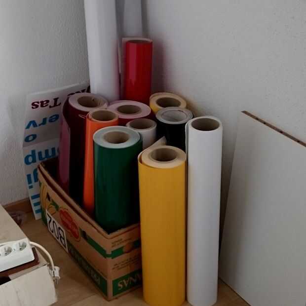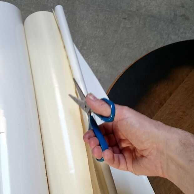 Poner el vinilo en la mesa y pega la parte donde se quita el respaldo sobre la mesa.