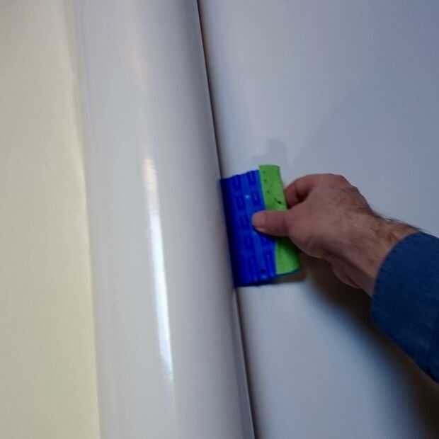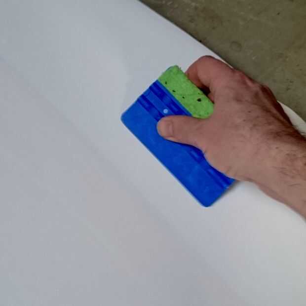 Ahora puede quitar poco a poco el resto del papel del forro y pega el vinilo en suavemente con una espátula.