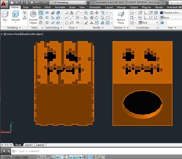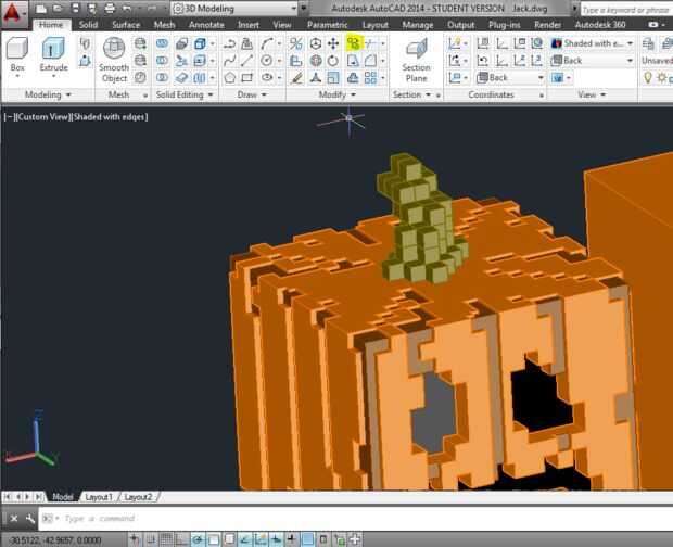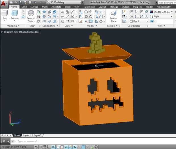 Feliz Halloween de todos. En este instructable, voy se que muestra cómo crear un inspirado en Minecraft gato-o-linterna con AutoDesk de AutoCAD. He utilizado la edición de 2014 actual para este proyecto, pero casi cualquier edición debe ser capaz de realizar los comandos (por lo menos 2004 y más). Algunos conocimientos previos de AutoCAD será necesario para ejecutar los comandos y comprender cómo rotar objetos y la pantalla, pero los comandos ellos mismos y la lógica detrás de ellos, se enumerarán.