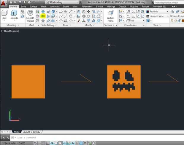 Después de crear estos cuatro planos sólidos, necesitamos darles una cara fácil de usar. El comando subtract, primero seleccione la zona que desea tener partes del (la caja externa), click derecho/enter, seleccionar la parte que desea restar (ojos y boca) y pulse Entrar/derecha haga clic en.