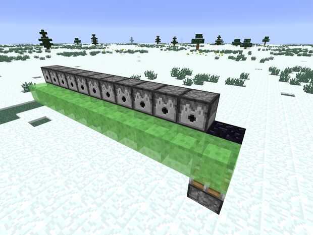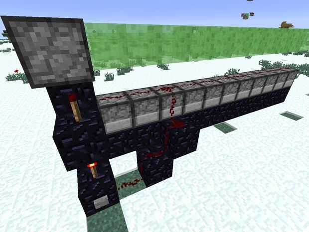 En primer lugar, añadir un pistón pegajoso en el suelo, luego de 12 cuadras de la superficie del pistón pegajoso de limos. A continuación, agregue una línea de obsidiana 12 detrás de los bloques de limo. Ahora Añadir 11 dispensador en línea de forma partida de obsidiana al final. Detrás del pistón pegajoso, deja a 1 cuadra del espacio y agregar una obsidiana con un botón y una antorcha de redstone colocado en él. Después de eso, debe desactivarse lugar una obsidiana en forma de L desde el inicio de la obsidiana que se colocó detrás del bloque de limo, luego agrega otra antorcha de redstone en la estructura de obsidiana en forma de L, la antorcha de redstone. Agregue otra línea de 12 bloques de Baba a partir de la parte superior de la estructura de obsidiana en forma de L, luego agregue otro pistón pegajoso hacia el primer bloque de Baba a la estructura de obsidiana en forma de L. Usando la obsidiana restantes, construir una escalera como la estructura en el depósito de la obsidiana con el botón y agregue redstones desde el botón a las escaleras y en los depósitos. (Ver imagen arriba)