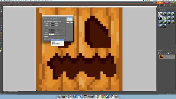 Hay toneladas de papercraft sitios por ahí que tienen patrones de este tipo de cosas. Hice una búsqueda rápida y una calabaza Minecraft se encuentra en minecraftpapercraft.com (mis hijos estaban claros que querían la calabaza y no el gato ' O la linterna). He importado en Photoshop Elements y redimensionada al tamaño que necesitaba. Era borrosa al principio y me encontrado que por remuestreo utilizando "vecino más cercano" (ver foto) hace las líneas agradable y crujiente.