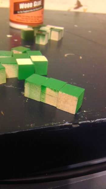Separar los cubos en 6 pilas para la pintura de aerosol. Cuando los cubos de pintura a pistola spray que pinta 2 caras del cubo como en la imagen. El back-end debe ser el regular madera sin pintar. Hacer esto para cada color.
