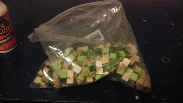 Después de que los cubos se han secado poner un puñado de cubos negros de al lado y el resto en una bolsa de plástico y mezclarlas bien. El diseño de plantas trepadoras es un patrón al azar de todos los cubos de color.