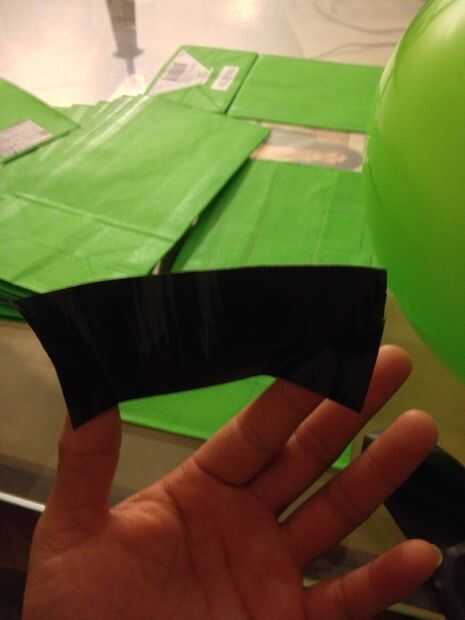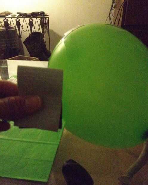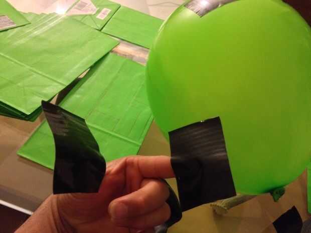 -Cortar 6 pulgadas de la cinta, doblar por la mitad y cortar la cinta. -Colocar 1 trozo de cinta en ballon. * Usando el rollo de cinta adhesiva, espacio (globo ocular) los ojos. -Coloque otra pieza en el lado opuesto del rollo.