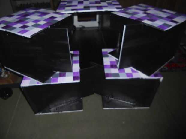 Pies: Los pies son la parte más complicada. Puede haber una mejor manera pero es cómo surgió con la mía. Bien sean 8" alto o 10" de alta para un niño más alto. El ancho de los pies debe ser la mitad de la anchura del cuerpo. Así que para mi hija, sus pies eran 8 "x 7" para la pieza frontal y 8 "x 8" para los lados. Esto es causa las enredaderas son cuadrados, pero las personas no son. OK así que tome sus 3 lados y cinta juntos. Hacer una pieza superior que es 7" ancho y profundo de 5" o 3" más pequeño que su tamaño completo. La cinta en la parte superior del pie. Hay otra pieza que va en el lado interior del pie. Es amplia de 2" y 5" de alto. Esto se graba en la parte posterior del pie con las tapas que empareja y el boquete en la parte inferior. OK ahora haces otra pieza 7" de ancho y 10 a 12" largos. Esta es la pieza que la pierna del niño se golpee contra a mover hacia arriba y hacia abajo los pies. Esta pieza en la parte inferior del pie de cinta y ángulo hasta golpeó que el 2" nuevo guía. Así que básicamente tienes esta pieza sobresale la parte posterior del pie en un ángulo. Pintar los pies pero dejan las dos últimas filas en la parte delantera de cada pie, los dedos del pie. Será pintados gris oscuro y negro. Coloque su cuerpo hacia abajo sobre una mesa. Los pies deben ser lugar encima de la caja y alined con la parte inferior del cuerpo. El interior de la cinta con la cinta fuerte. El pie debe poder flop hacia abajo y permanecer en el lugar.