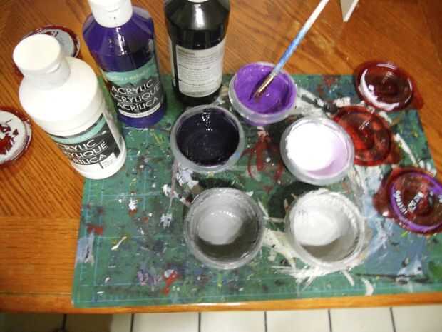 Pintura: compré las copas de aperitivo con tapas para preservar la pintura. Uno se llena con el color principal. Uno es una versión ligera del color, uno es una versión oscura del color. Luego hice un gris claro y gris oscuro. Trabajé con un color y lo hizo unas 3 cuadrados de cada color. El blanco de la espuma era el último color. Para los dedos del pie de la enredadera usé negro y negro con una gota de blanco así que era muy oscuro negro gris o claro.