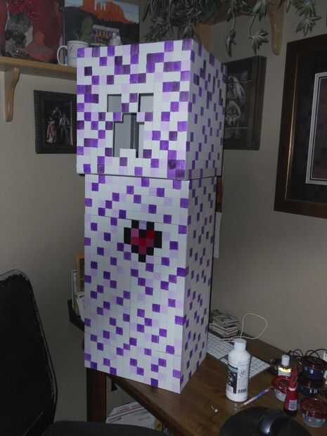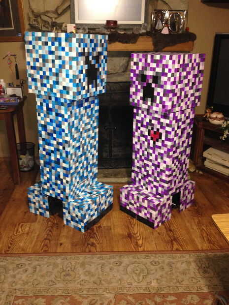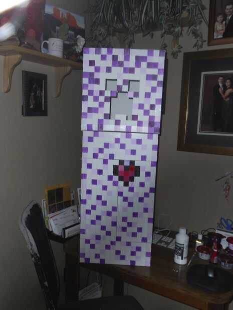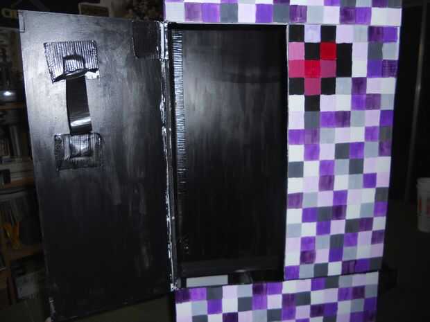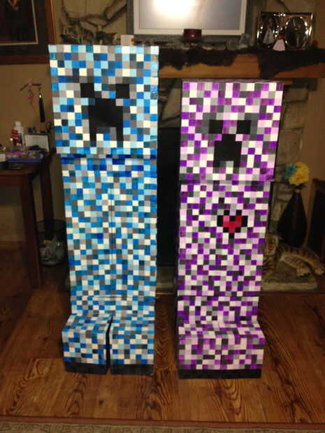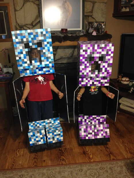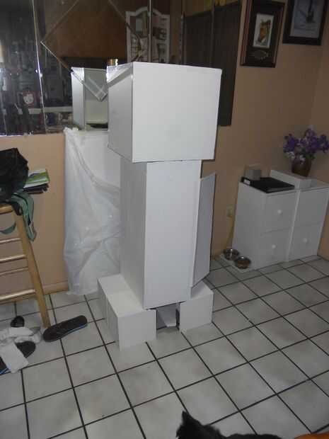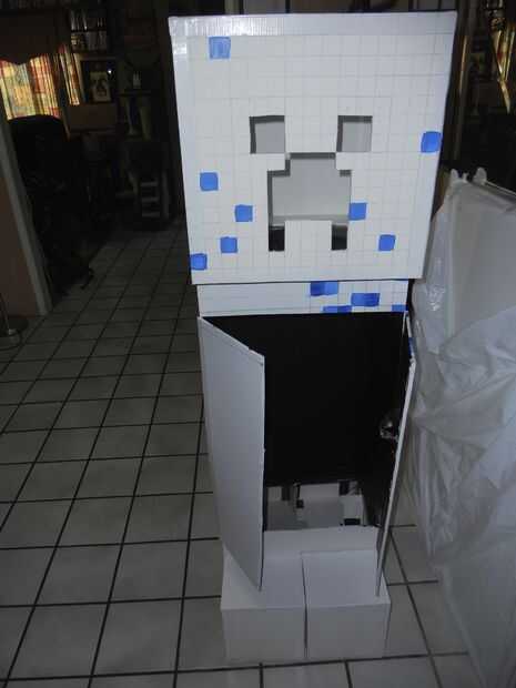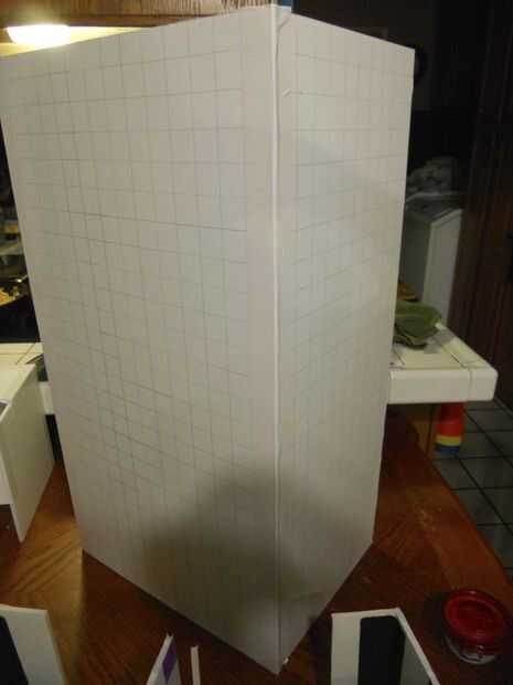 Cuerpo: el cuerpo era 14" de ancho y lo hice 10" de profundidad. Luego hice 26" de alto. Cómo llegué a eso fue a tomar su altura desde el hombro hasta el suelo. Menos 8" para la altura de los pies y otro 4" para la separación al suelo. Necesita 4 lados. 2 que son 14 x 26 y 2 que son 10 x 26. Se necesita una pieza más que la tapa a la caja donde la cabeza se pegue hacia fuera. Medir el interior de su caja y cinta juntos. Corte y apertura en la parte superior de la cabeza. Hacen 2" a 4" de ambos lados. Poner cuadros de velcro en cada uno de estos rincones. Este es su punto de anclaje de la cabeza. Coincidir con la cabeza hacia los lados. Debe colgar sobre unos 3" o cuadrados. Añadir el velcro a la parte superior de la cabeza. Ahora puede tomar y en la cabeza. Después de que su cuerpo se hace ya tiempo, para las puertas. Por esta razón es bueno tener un cuerpo incluso. Mida hacia abajo unos 5 cuadrados de la parte superior del cuerpo y la parte inferior del cuerpo. Las puertas serán las plazas restantes. Corte a lo largo el el ancho del cuerpo, todos de 14" y luego del medio. Usted es el tamaño de la puerta. Ahora debe tener dos puertas que hacen pivotar. En este momento reforzar el interior costuras con la cinta más fuerte. A no poner en la puerta. Pinte el interior negro. Para los tiradores de las puertas sólo utiliza la cinta más fuerte, dobla una pieza por la mitad y otros dos utilizados en la cinta hacia abajo. Para hacer la puerta estrecha, compré 1" largo imanes encontré en Lowe y Home Depot. Super pegado en un lado hasta secarse y luego los emparejados al otro lado. Esto es en el interior de la puerta. Ahora cuando las puertas permanecen cerradas (con suerte). Pintar las plazas y se hace el cuerpo. Los pies Haz Unidos después de que se hacen pintadas.