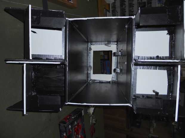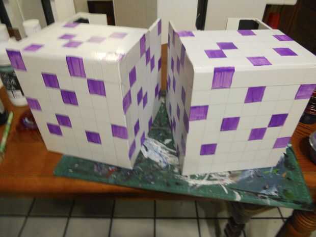 Cabeza: Los hombros de mis hijas era 14" de ancho. Por lo que su cabeza fue también 14" e hice una caja de 14" fuera del tablero de la espuma y cinta blanca como el tablero es blanco y utilizar la cuadrícula 1" para usted a su cinta para bordes limpiador. Se necesitan 6 piezas para la cabeza: la pieza de cabeza frontal será recortar los ojos y la boca de la enredadera. La pieza del fondo será una abertura lo suficientemente grande para la cabeza para conseguir, pero no demasiado grande. Hice la apertura de 4" de los bordes. Yo también reforzó el interior parece con más cinta adhesiva. Pinte el interior negro y negro tela o pantalla de material para cubrir las aberturas de la cara en el interior. Se trata de la cabeza.