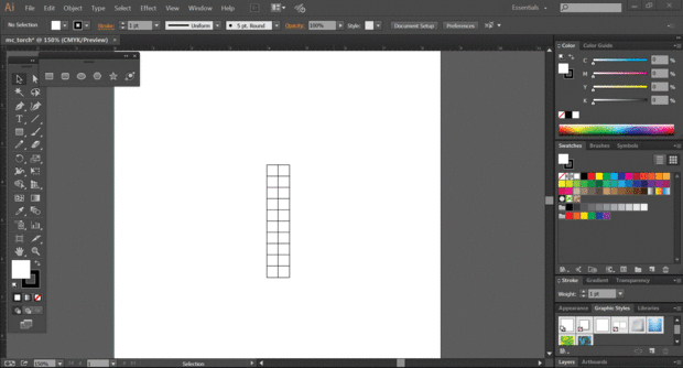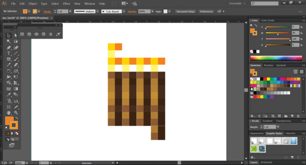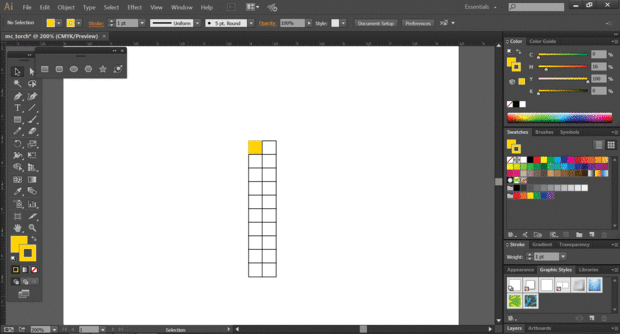 Para empezar, entré en Illustrator, tienes la herramienta Rectángulo y haga clic una vez en medio de la página. Luego entró 0.6 para el ancho y 3 para la longitud, luego entrar. Esto creará un rectángulo en la página que será tu guía. Continuación, haga clic en la esquina superior derecha del rectángulo nuevo e introduzca su tamaño de píxel, mina fue 0.3 por 0.3, simplemente dividí mi ancho de 6 pulgadas por 2 (el número de pixeles en el ancho), que me consiguió.3, entonces sabía que tenía que ser un cuadrado así que sólo hice 0.3 por 0.3. Por ahora, está bien mantener los píxeles con un relleno blanco y un trazo negro, va a cambiar más adelante. Una vez que tuve mi primer pixel, había seleccionado con la flecha negra y luego copiar (Ctrl + C) y el pegado en la parte superior (Ctrl + F). Probablemente no verá los cambios a la imagen porque el comando Ctrl + F pega el objeto que fue copiado, derecho sobre el objeto que se ha copiado. El nuevo píxel debe seleccionarse automáticamente cuando pega. Mientras todavía está seleccionada utilice su llave de flecha derecha para moverlo (a la derecha) 21 teclas oprimidas (pulse la tecla de flecha derecha 21 veces). Esto es solo si usas las mismas dimensiones como a mí, si no, puede utilizar modo de contorno (Ctrl + Y) para línea de ayuda por las dos plazas. NO HAGA CLIC Y ARRASTRE, HARÁ SU CUADRO INEXACTAS, CON LAS FLECHAS NO LO HARÁN. Luego vas a seleccionar dos pixeles que ahora luego Ctrl + C, Ctrl + F y luego hacia abajo 21 veces con la flecha hacia abajo, luego Ctrl + C, Ctrl + F y 21 veces. Seguir haciendo esto hasta que tengas 10 píxeles hacia abajo y bajar por los píxeles a la parte inferior de la guía que hiciste. Ahora a los píxeles de color. Yo busqué en Google "diseño de antorcha de minecraft en google imágenes y encuentra una foto de minecraftforum.net. Entonces esto había utilizado como guía. He intentado reproducir los colores de cada píxel individual utilizando la plataforma de swatch y los deslizadores de color por encima de la plataforma de muestra, además, es importante definir el movimiento como el mismo color que el relleno para cada píxel. Una vez que terminé el primer lado, seleccioné todo, luego hice Ctrl + C, Ctrl + F, y había movido sobre 45 veces con la flecha derecha. Luego, seleccionar todo, Ctrl + C, Ctrl + F y se movió a la derecha 90 veces (sí, esto puede conseguir tedioso).