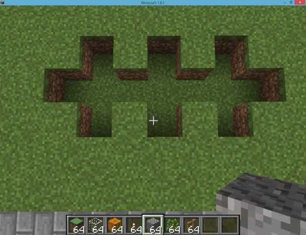 En primer lugar, Cave una una capa del foso de siete bloque abajo. En los bloques de numeración, excavar un bloque a cada lado como se muestra, cruzar el foso. Esto crea ocho bloques de siembra separadas por un bloque vacío de sus vecinos.