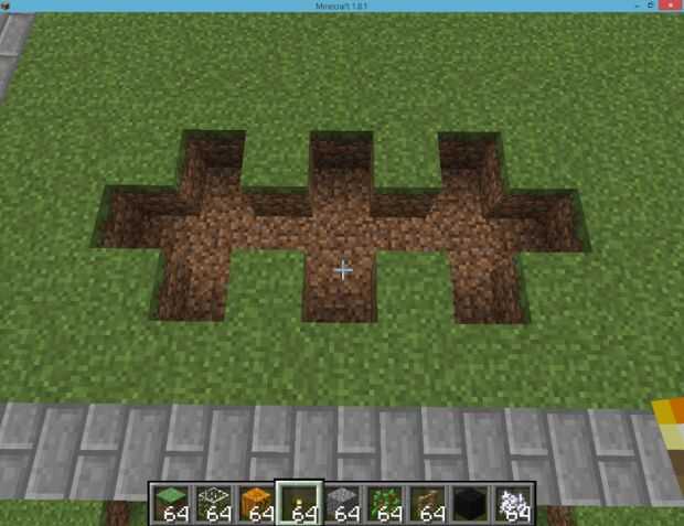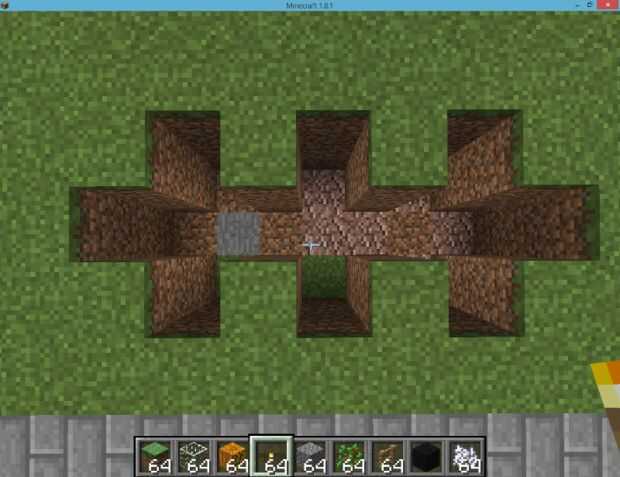 Una vez más, cavar una zanja de siete cuadras de largo, y luego sacar los bloques a cada lado de los bloques de numeración para cruzar la zanja como antes. Esto excavar hasta una profundidad de tres bloques.